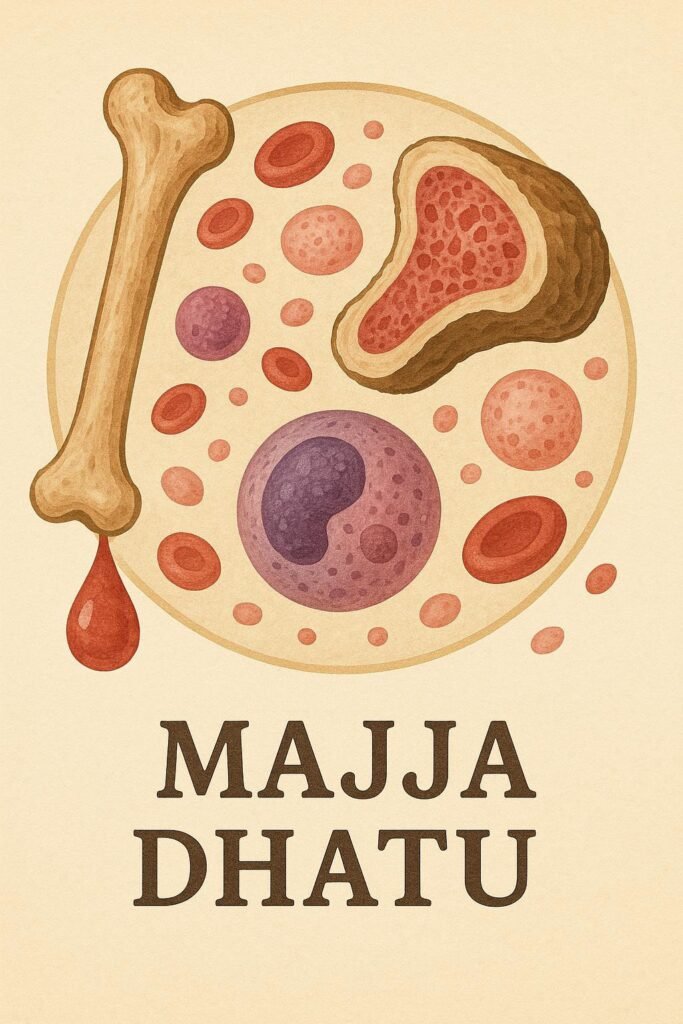 Majja Dhātu is the sixth dhatu (tissue) in the sequence of the Sapta Dhatus (seven bodily tissues). It is formed from Asthi Dhatu (bone tissue) and serves as the nourishing base for the Shukra Dhatu (reproductive tissue). Majja is primarily responsible for filling the bone cavities (asthi-srotas) and nourishing the nervous system and bone marrow.